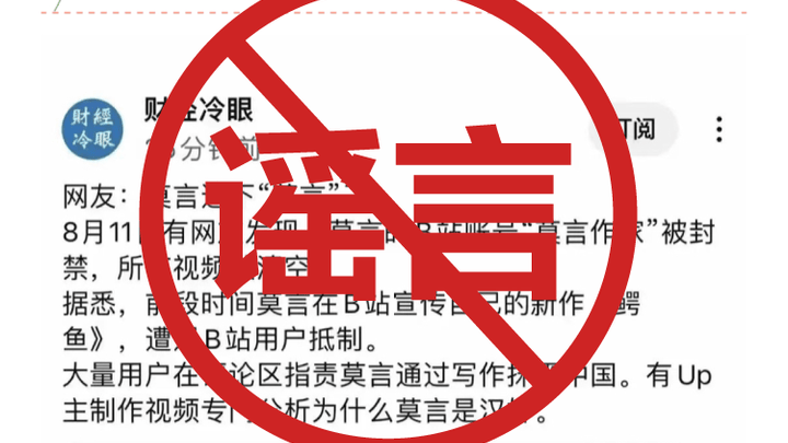 #莫言B站账号被封系谣言# #莫言# 哔哩哔哩微信公众号发文称近期,公司关注到有网络账号杜撰称“莫言B站账号被封”等文章。经核实,此前有用户冒名注册“莫言作家”账号,并搬运莫言本人在其他社交平台上发布的内容。B站已对该高仿账号进行永封处理并下架全部侵权稿件。而事情起因是莫言和余华录了个节目《我在岛屿读书2》,余华问莫言怎么那么会运营B站,好受年轻人欢迎,莫言说他没有开号啊,莫言下面的同事就去问B站运营,运营核实是高仿号后,就帮莫言把高仿账号永封了,邀请莫言后续开号。