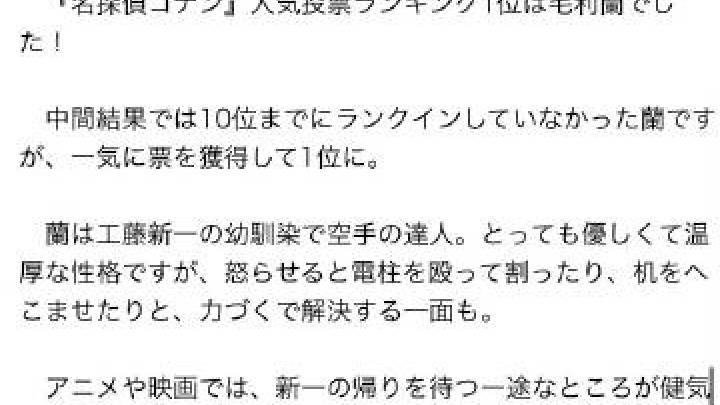 角川电击ONLINE#名侦探柯南# 最新人气投票排名 结果发表,恭喜#毛利兰人气稳居第一# !! 1位:毛利兰 2位:灰原哀 3位:怪盗基德 4位:安室透 5位:赤井秀一 6位:江户川柯南 7位:服部平次 8位:工藤新一 9位:松田阵平 10位:贝尔摩德